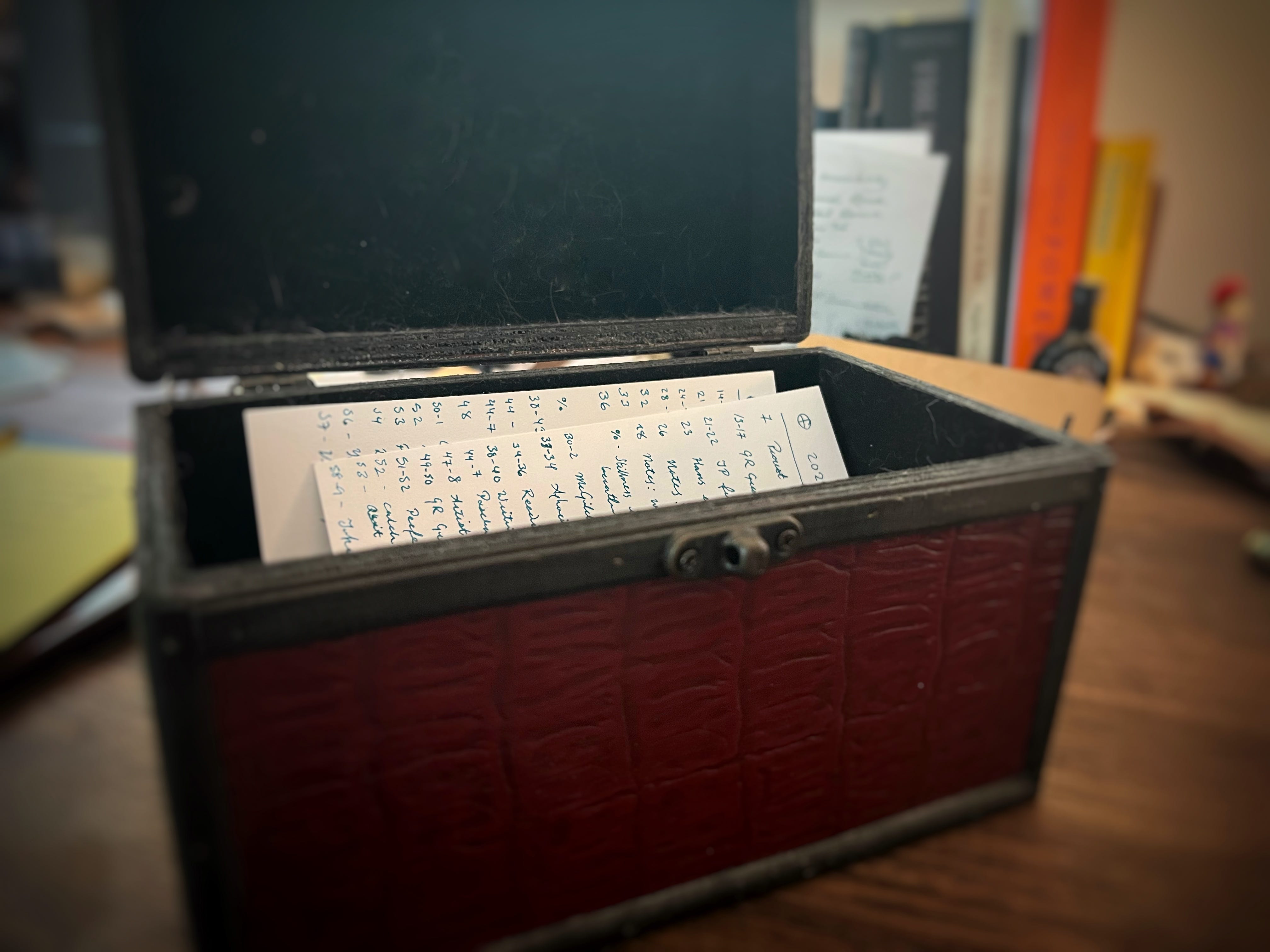 When I was growing up, libraries had physical card catalogs which told you where books were to be found. You would page through them until you found a book to explore, and its numbers would point you to the right shelf. Likewise, you can stash your Index Cards in a recipe card box, and voilà you have your own Card Catalog.