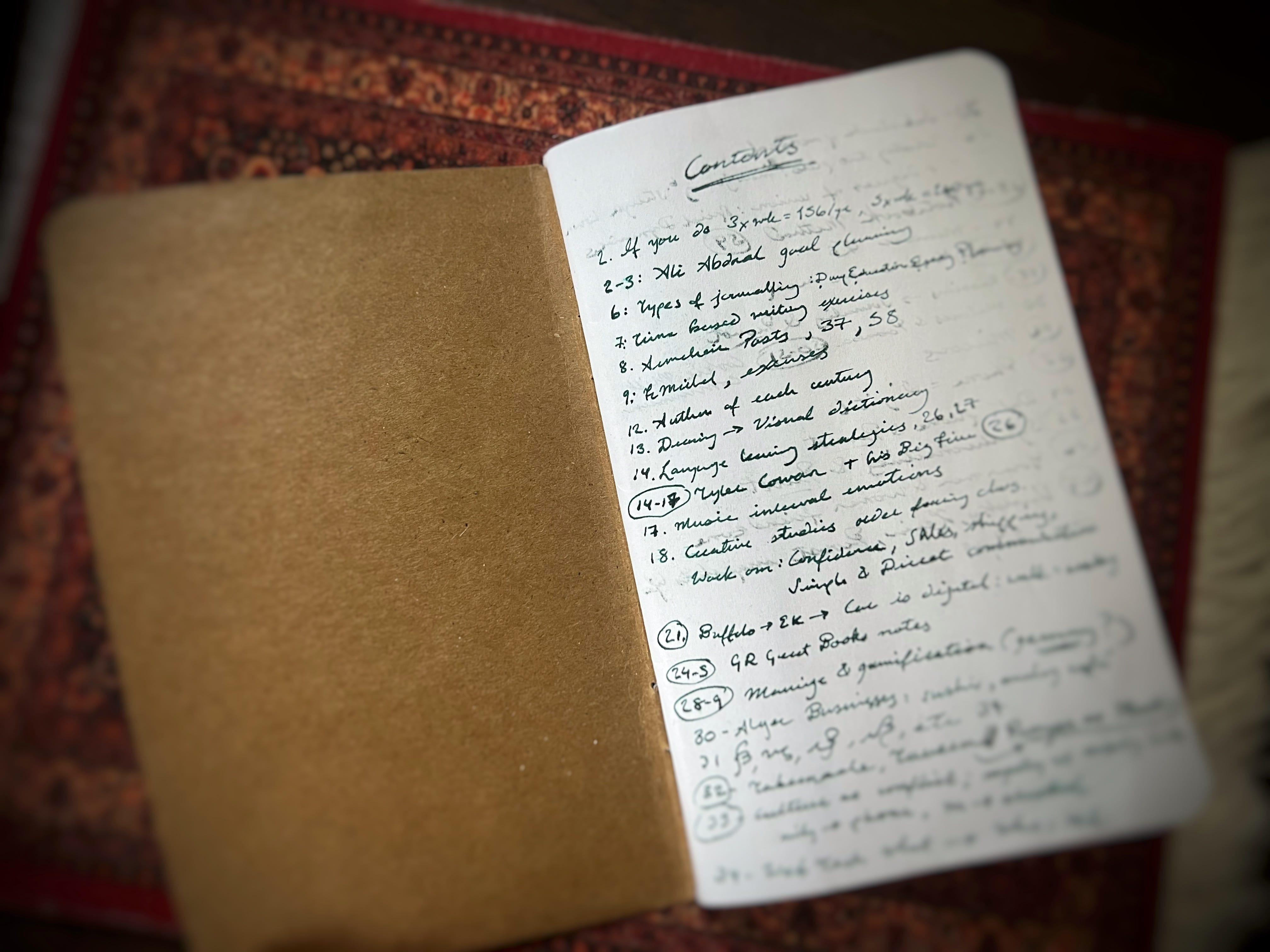 Now we’re going to log our remaining ideas in an Index. Usually this covers the last 2-to-3 pages in the back of my notebooks. But the front works as well (as you can see in the picture above.) Since most pocket notebooks sadly lack page numbers, I always begin by scribbling them in the corner of each page. Once I’ve numbered all the pages, I do a simple entry of the pages that haven’t been crossed out. Each entry is a page number and a few keywords to jog my memory of what lives on that page.