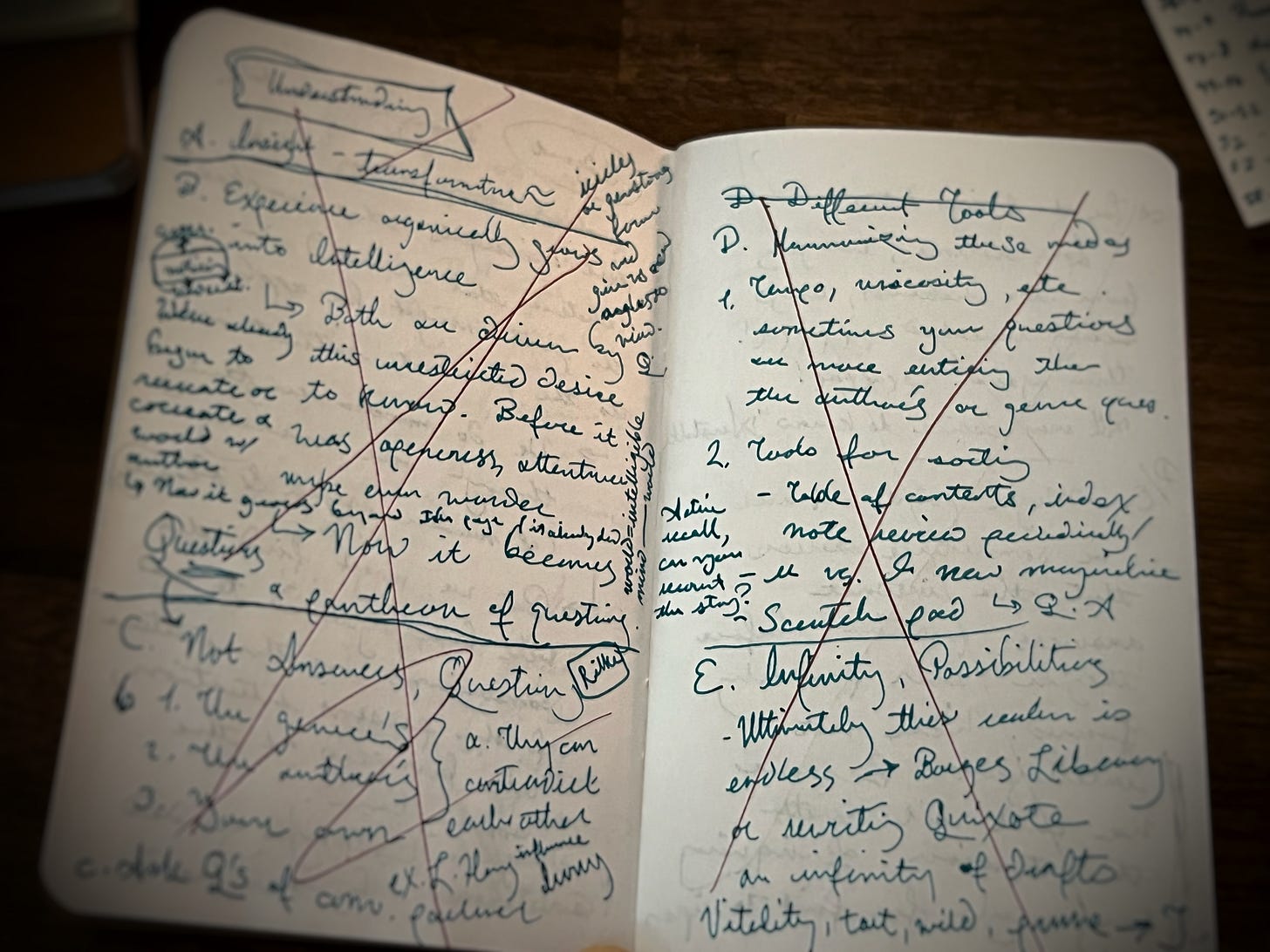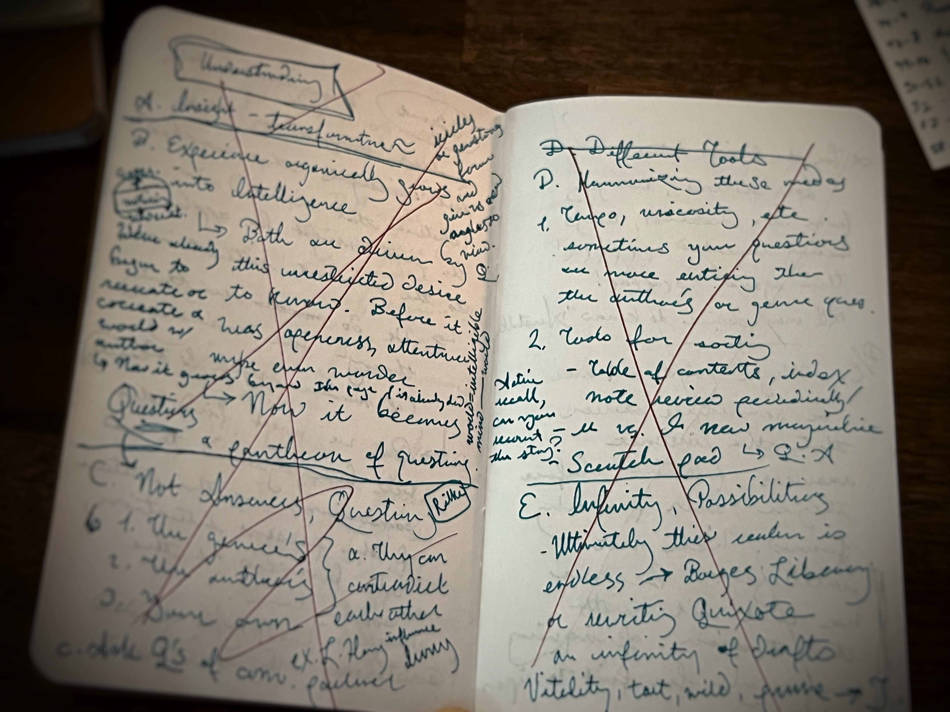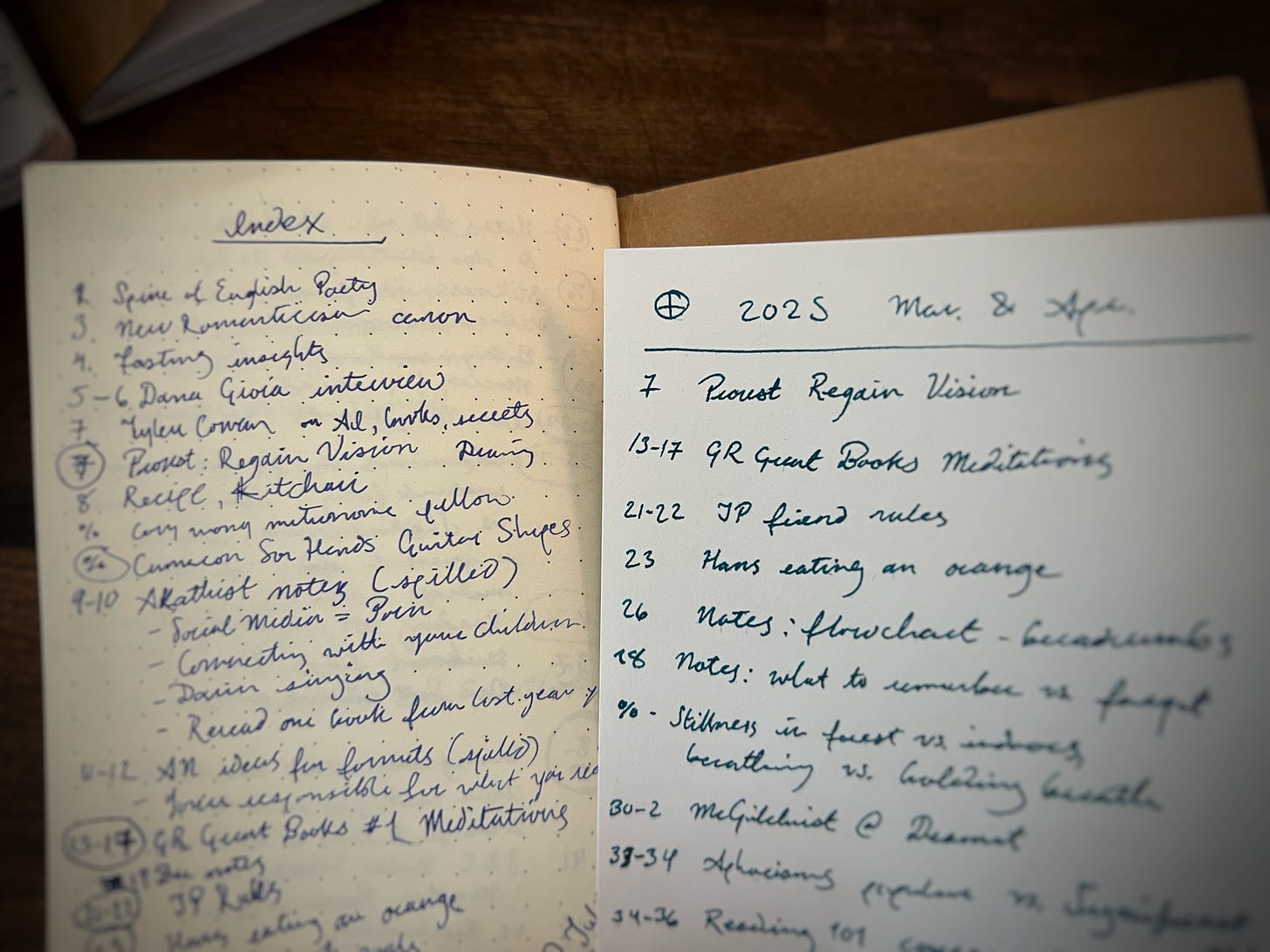 Each of these cards is formatted to give me not only the entries, along with the kind of notebook (in this case, ⨁) and the date of the notebook (ex. 2025 Jan–Apr). While shuffling through a handful of these cards, I can spot a few entries I want to revisit and—even if they’re in different notebooks—I can track down their original entries on my shelf, down to the exact page. I’ve just boiled thousands of pages down to a handful of index cards. I can breathe easier.