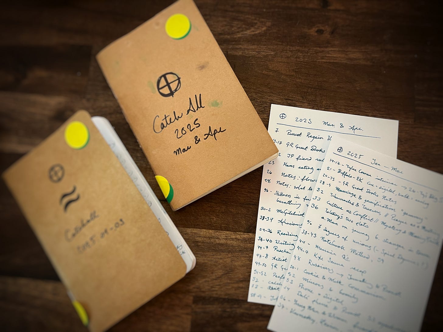 I really enjoyed reading about your system! In an amazing coincidence, I wrote this morning about what I'm doing with my physical notebooks. While I also have a stack of catch-alls and planners, I'm focused on my journals, and the solution I'm trying is using AI to digitize and organize them: https://bdewey.substack.com/p/notebook-index